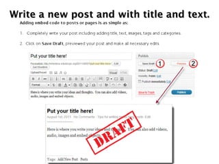 This document provides instructions for embedding a Slideshare presentation into an Edublog post. The instructions are to write a blog post with title and text, find the desired PowerPoint file on Slideshare, copy the embed code, paste the code into the HTML view of the blog post, and publish and close the post.
