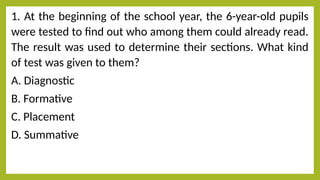 The document discusses various aspects of assessment in education, including the types of assessments (diagnostic, formative, placement, summative) and their purposes. It presents several scenarios illustrating how these assessments are applied in classroom settings, emphasizing the importance of understanding student performance to guide instruction. Additionally, it covers the distinction between measurement and evaluation, as well as considerations for effective assessment practices.