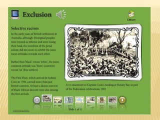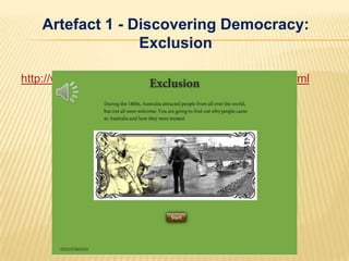 The first artefact discusses exclusion in Australia, presenting information over 11 slides about why certain immigrant groups came to Australia and attitudes towards non-white immigrants. It provides primary sources but lacks interactivity.