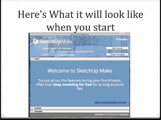 This document provides an introduction to basic tools and functions in SketchUp for 3D modeling. It explains how to use shape tools to draw rectangles and circles, the push/pull tool to extrude objects in 3D, and how to manipulate objects by drawing on faces or edges. The document also describes viewing tools like orbit, pan, and zoom and how to select objects to move or erase edges. It encourages exploring more advanced tools and functions.