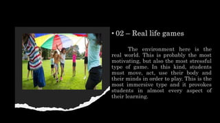 This document discusses game-based learning (GBL) and its benefits and pitfalls. It describes three types of GBL: board games, digital games, and online games. Board games like Monopoly can be adapted for educational purposes. Digital games involve online boards and virtual collaboration. The benefits of GBL include motivation, inclusion, student-centered learning, critical thinking, group work, and creativity. However, excessive competition for rewards in games can shift the focus from learning to winning and diminish collaboration. To avoid pitfalls, GBL should not always be used and the focus must remain on learning outcomes rather than just competition.