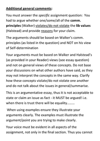 This document provides feedback and guidance for an assignment on the communication principles of Walker and liberal values of Halstead. It includes codes to identify issues in the assignment response and general comments on properly answering the question, basing arguments on the readings, using examples, referencing, and developing one's own voice. The document also provides exam preparation advice, such as understanding versus memorizing the readings, following previous feedback, referencing techniques, time management, writing clearly, and not getting stressed. Students are encouraged to do their best and that the tutor believes in them.