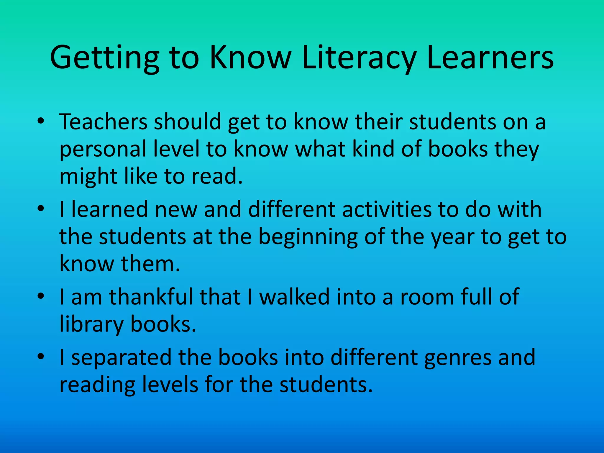 1) The document discusses strategies for getting to know students as literacy learners, including personal observations, assessments, and interest profiles.
