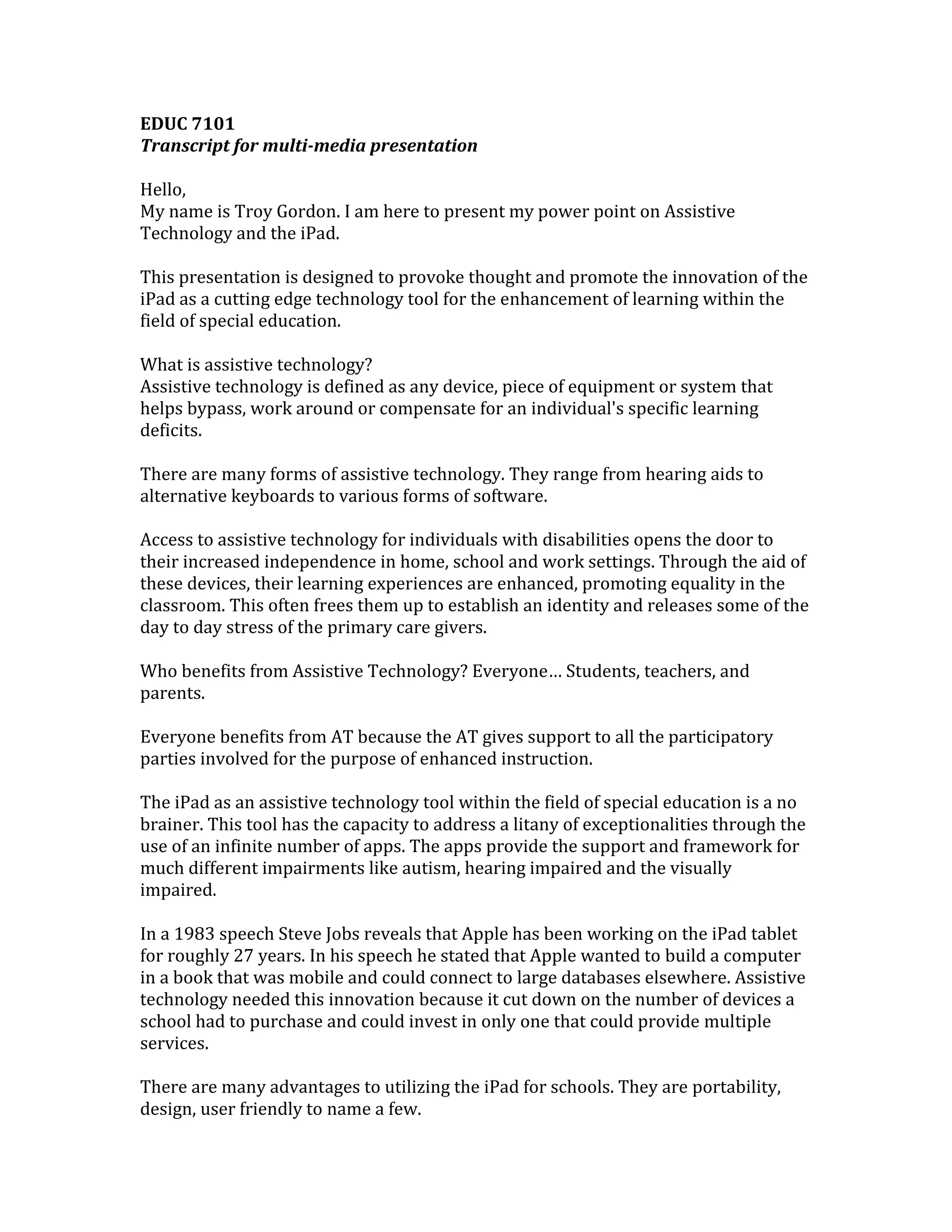 The document discusses the use of iPads as assistive technology tools for special education. It defines assistive technology as any device that helps bypass or compensate for learning deficits. The presentation argues that iPads are well-suited as assistive technology tools due to their portability and wide range of accessible apps that can address different disabilities. It also discusses factors influencing the adoption of new technologies in schools, such as targeting respected professionals and providing training and support.
