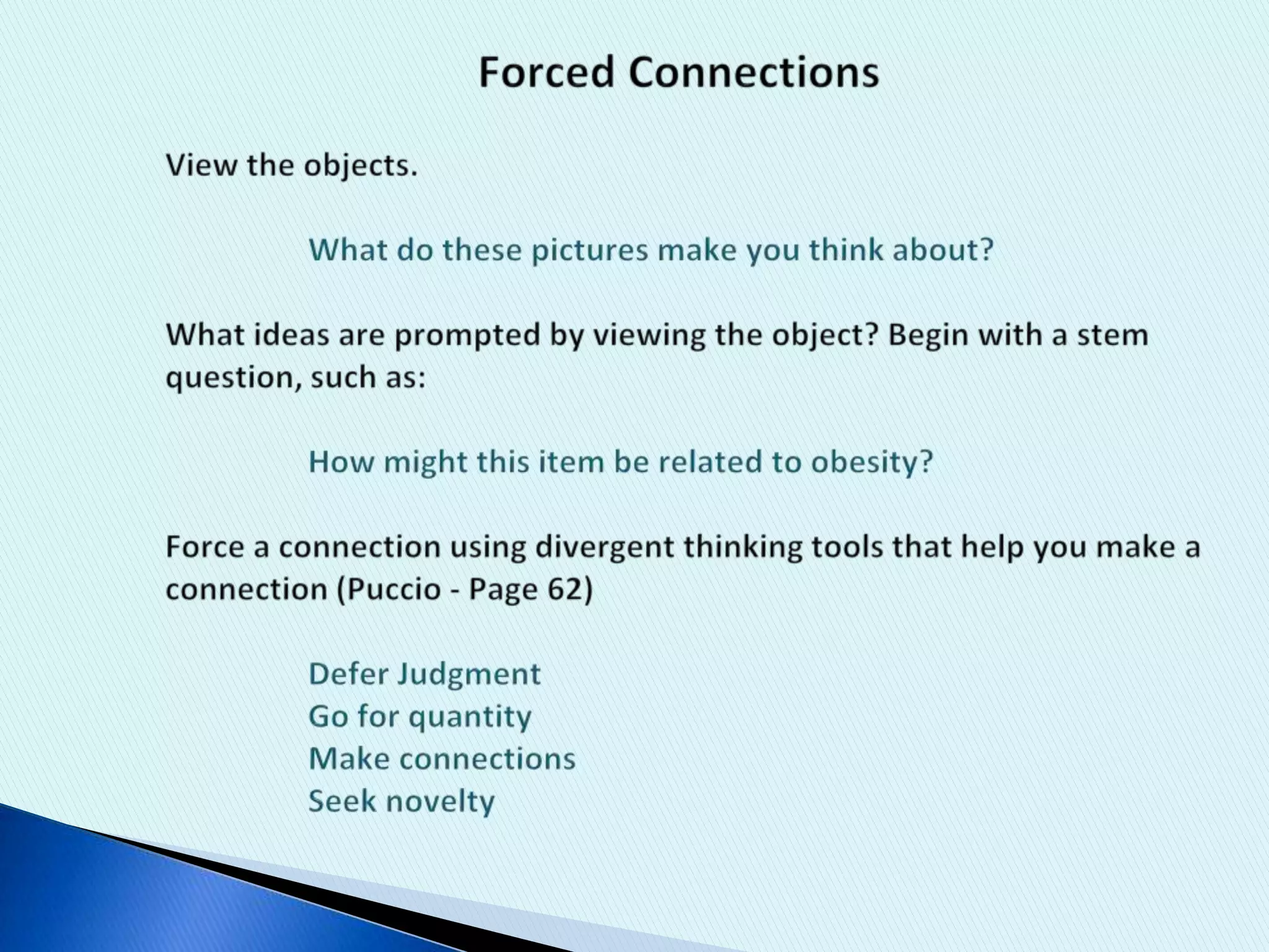 This document discusses creative problem solving approaches to addressing the issue of student obesity. It identifies challenges like sedentary lifestyles, poor eating habits, and a lack of understanding of dietary needs. It then presents an ideational thinking tool called "forced connections" that encourages looking at objects and brainstorming how they could relate to obesity, without judgment, seeking novelty and a high quantity of ideas. The goal is to generate new problem and solution perspectives on student obesity.