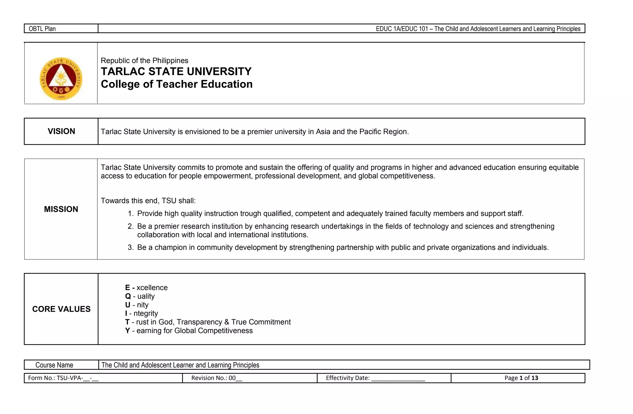This document outlines a course plan for EDUC 1A/EDUC 101 - The Child and Adolescent Learners and Learning Principles. The course focuses on child and adolescent development with emphasis on current research and theories regarding biological, linguistic, cognitive, social and emotional dimensions. The course also addresses laws, policies and procedures related to providing safe and secure learning environments. The course is divided into 4 units covering basic concepts, biological development, cognitive development, and social/emotional development. Each unit utilizes various teaching and learning activities such as discussions, simulations, and research projects to help students understand key concepts and theories and their application to teaching approaches suited to different learners. Assessment tasks ensure students can demonstrate knowledge of child/