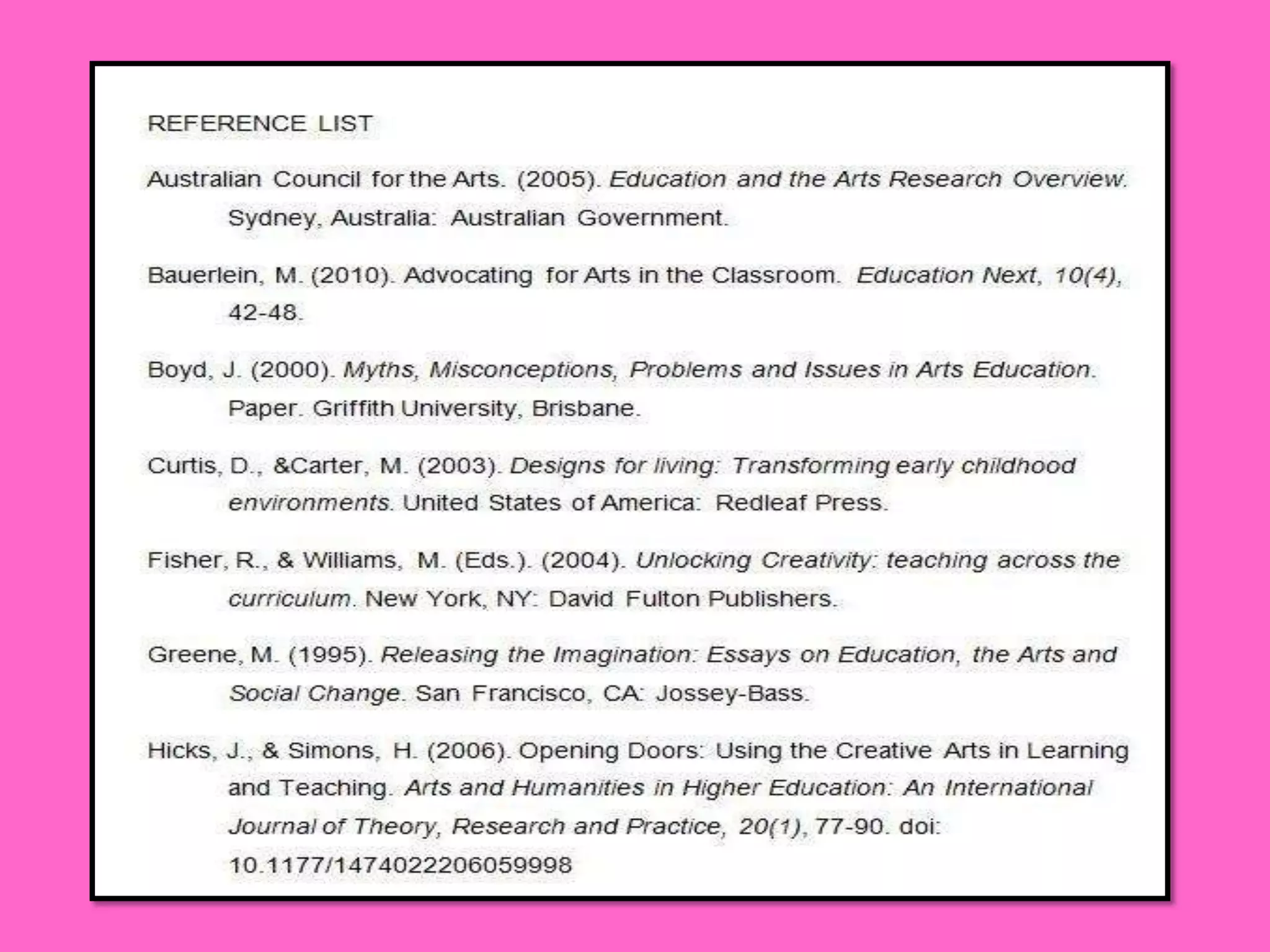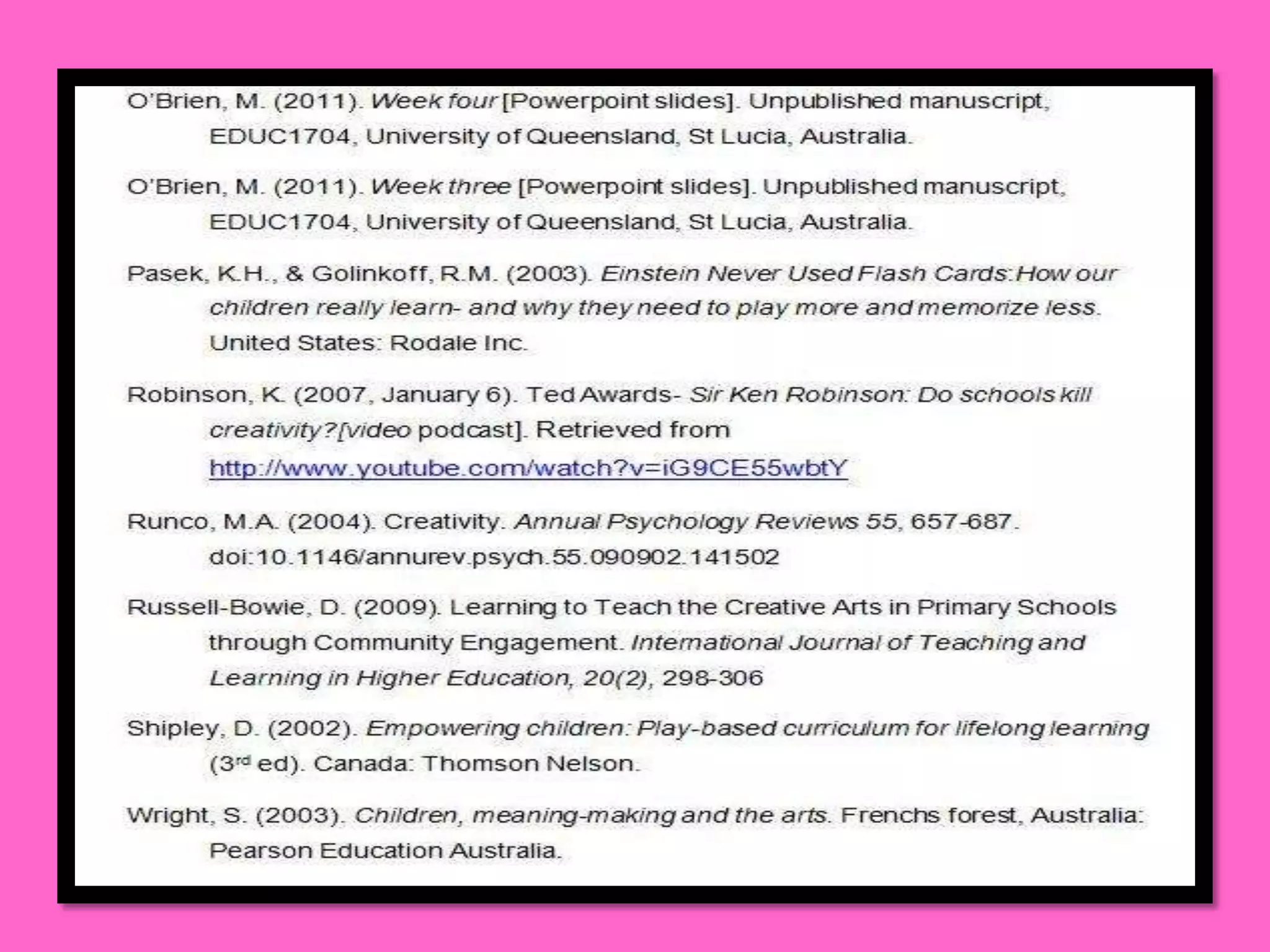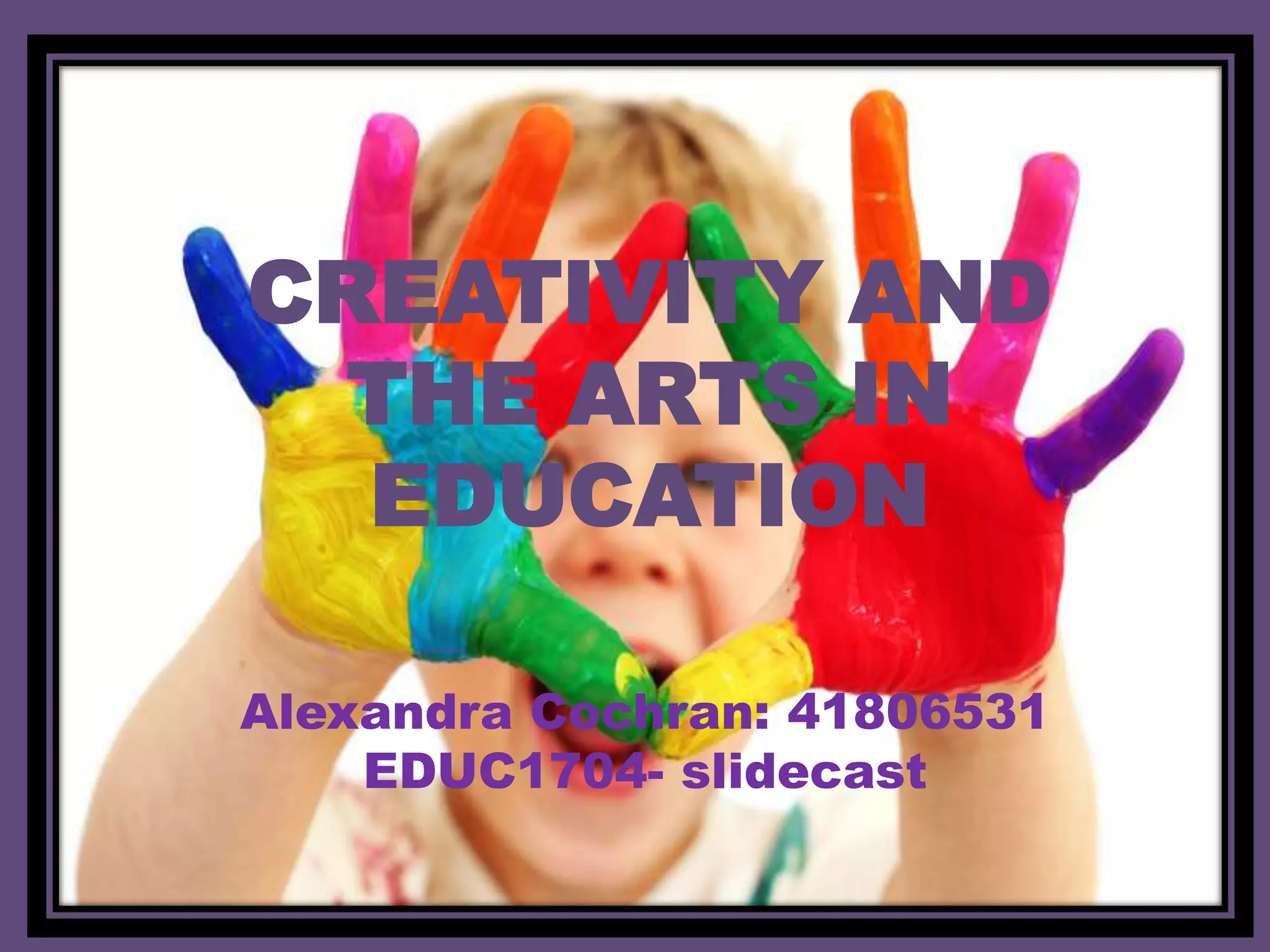 The document discusses the importance of creativity and the arts in education. It provides evidence from research that engaging with the arts can enhance literacy by 24% and mathematical capabilities by 6%. It also notes that creative activities that have no right or wrong answers can help reduce students' fear of failure. The arts are seen as important for developing problem-solving skills, thinking outside the box, and imagining alternatives. Teachers play a key role in scaffolding students' development in the arts.