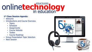 The document provides an agenda and overview for the first class session of an online education course. The agenda includes introductions, a course overview covering topics, schedule, assignments and resources, and group presentation topic selection. It also notes the date and topics for the next class session.