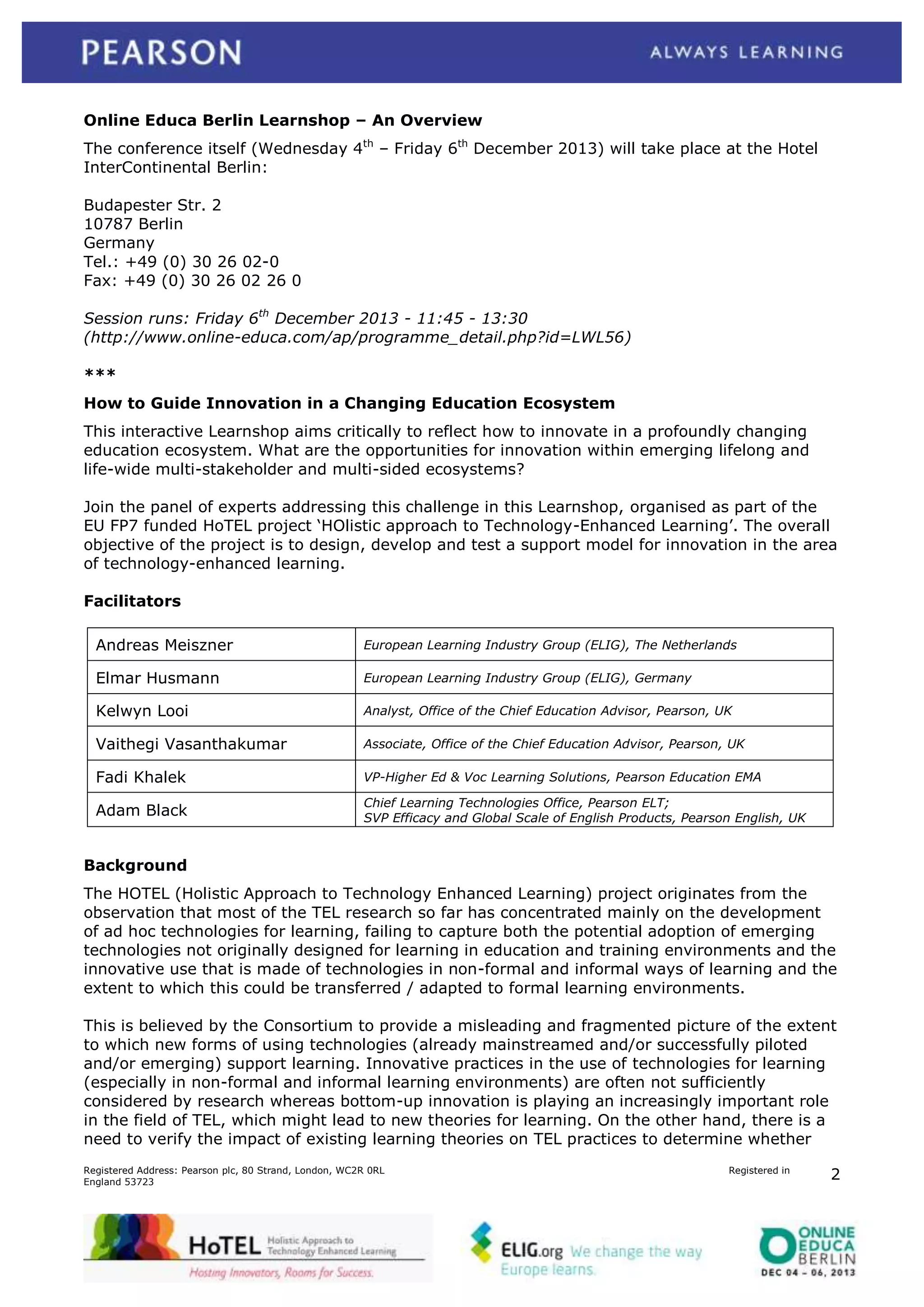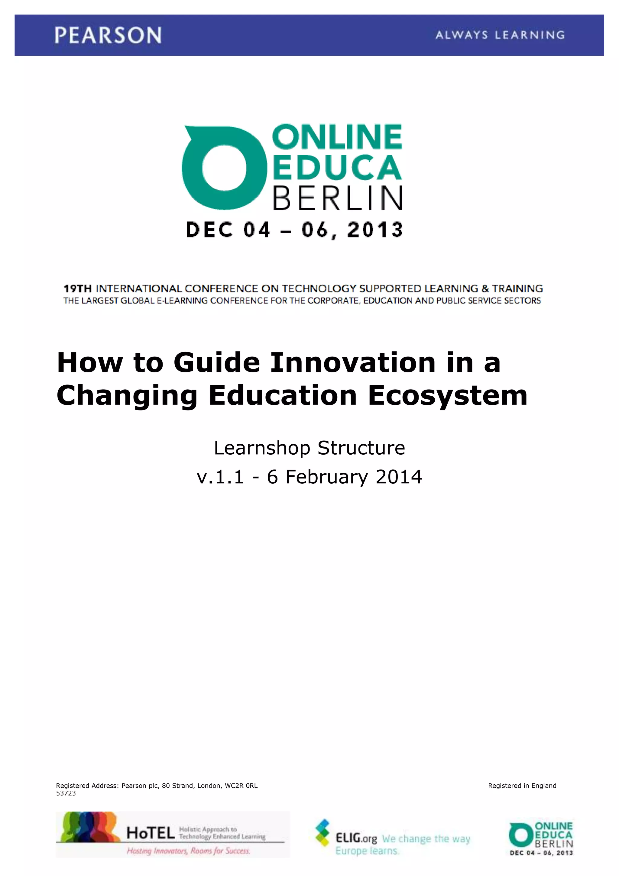 The document outlines an interactive learnshop designed to discuss guiding innovation in the education ecosystem, emphasizing the use of technology-enhanced learning and the Pearson efficacy framework. It details the event's objectives, structure, and guiding principles, targeting participants' engagement with technological innovations and assessment methodologies. Facilitated by experts from Pearson and the European Learning Industry Group, the learnshop aims to foster discussions on the efficacy of educational innovations and gather feedback for continuous improvement.