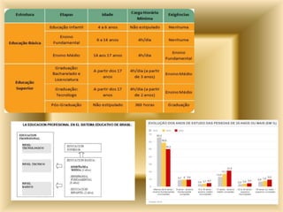 Em 2007, o Brasil tinha uma taxa de analfabetismo de 21,6% e 97% das crianças de 6 a 14 anos matriculadas na escola. A educação é um direito constitucional, promovida pelo estado, família e sociedade, visando o desenvolvimento humano integral. A desigualdade no ensino explica 35% das desigualdades sociais no Brasil.