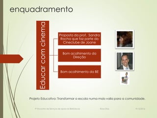 O documento descreve o projeto "Educar com Cinema" implementado no Agrupamento de Escolas de Gondifelos. O projeto tem como objetivo promover a cultura cinematográfica na escola e na comunidade através da exibição de filmes com debates subsequentes. O projeto tem tido bons resultados apesar de alguns desafios iniciais de comparecimento. Planeja-se expandir o projeto para novos públicos e atividades no futuro.