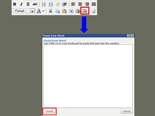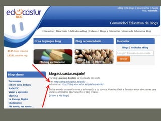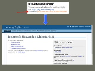 The document provides instructions for various activities to learn how to create and manage a blog. It outlines how to create a blog and choose a theme, write posts and add categories, images, links, YouTube videos, comments and pages. It also describes how to moderate comments and find external links to add to the blog. The overall purpose is to educate on the main blogging features and functions.