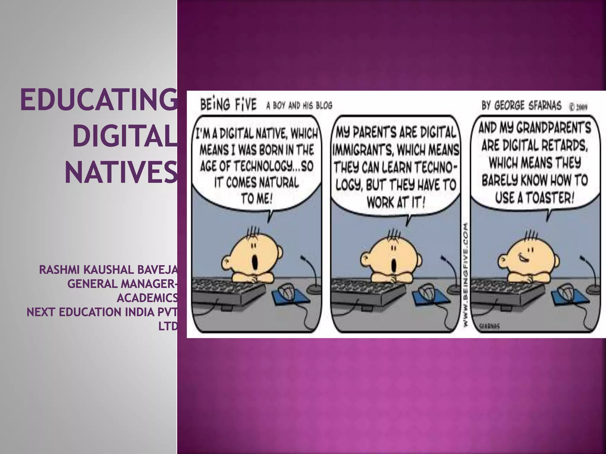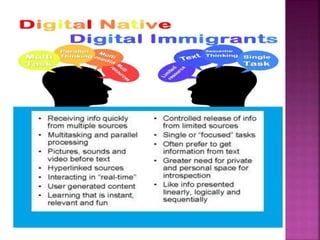 This document discusses the learning characteristics and preferences of "digital natives" - the generation that has grown up with digital technology and lives much of their lives online. It notes that digital natives prefer multitasking, visual communication, freedom of choice, customization, entertainment and speed in their work and education. While technology has transformed learning, there is a question of whether education should fully cater to digital native styles or teach them traditional structures. The document advocates designing learning environments that engage learners in constructing knowledge through communities and making sense of reality using cognitive tools and blended learning approaches.