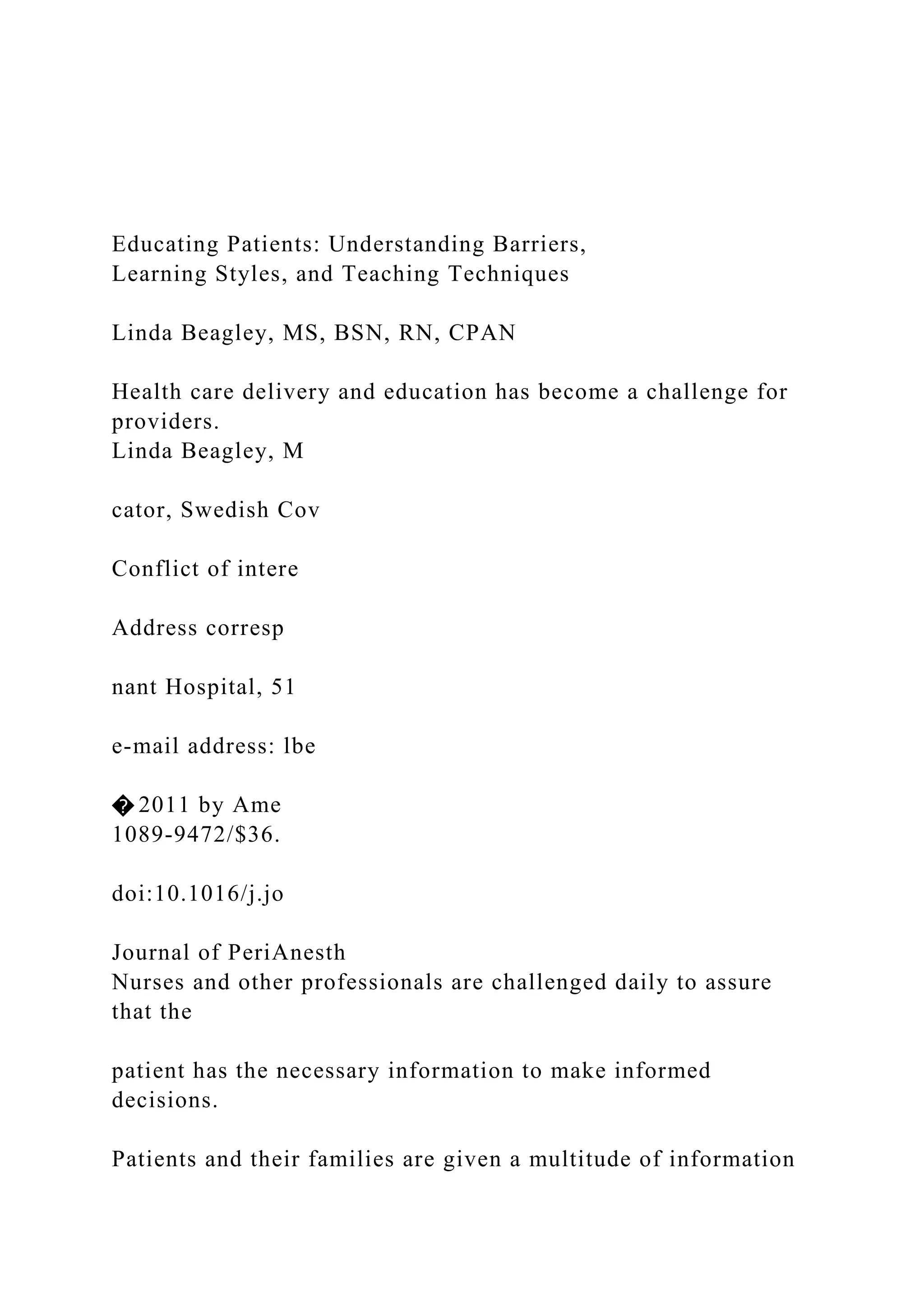 The document discusses the challenges healthcare providers face in educating patients due to various barriers such as literacy, culture, and physiological factors. It emphasizes the importance of assessing patients' learning needs and adapting teaching techniques to ensure effective communication. The article highlights the different learning styles and the significance of cultural competency in enhancing patient education and outcomes.