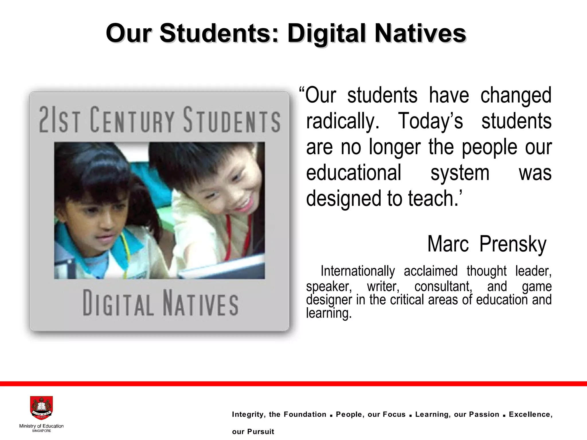 The Singapore Ministry of Education released a third ICT masterplan (mp3) to guide the strategic use of ICT in education from 2009 to 2015. The plan aimed to transform students into self-directed and collaborative learners through effective use of ICT and to develop their digital literacy. It outlined strategies for schools and teachers to integrate ICT into the curriculum and pedagogy and ensured students and teachers had adequate ICT infrastructure and support. The plan also emphasized developing students' cyber wellness and teachers' ICT competencies through various programs and initiatives.