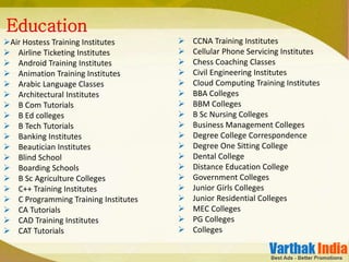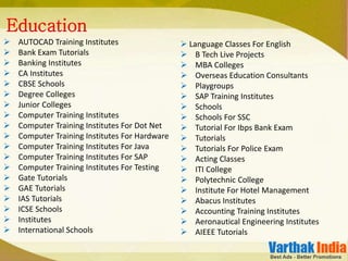 The document lists various types of educational institutions including schools, colleges, training institutes, tutorials and coaching classes across different subjects like computer training, languages, arts, sciences and more. It provides information on institutions for K-12 education, higher education, professional education and skills training.