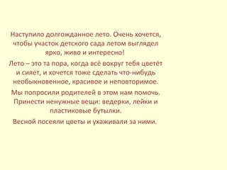Воспитатель детского сада «Золотой ключик» Светлана Подсекаева делится планами по beautification участка детского сада на лето. Для этого она привлекла родителей к сбору ненужных вещей и весной высадила цветы. Поделившись результатами, воспитатель надеется, что их идеи будут полезны другим.