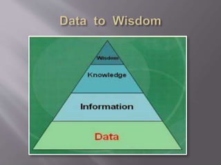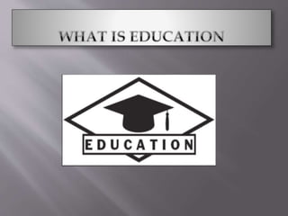 The document discusses the definitions and concepts of education. It defines education as the process of organizing society (Plato), actualizing the self (Allama Iqbal), suppressing evil (Shah Waliullah), and physical and ethical development (Aristotle). It distinguishes between learning as behavior modification through experience versus study as focusing the mind on a subject. Data is raw facts while information provides context and knowledge is understanding gained from experience. Wisdom applies knowledge through deep understanding. Education is the ability to think, observe, and learn through inherent, intellectual, sensory, intuitive, and revealed means.