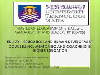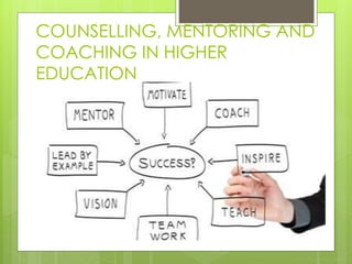 The document discusses counselling, mentoring, and coaching in higher education. Counselling involves talking through problems with a professional to gain insight and work towards acceptance or change. Mentoring pairs an experienced person with a less experienced one to facilitate growth through teaching, coaching, and challenging. Coaching focuses on improving specific skills and meeting goals set with the coach through direct feedback. While related, counselling, mentoring, and coaching each have distinct purposes, processes, and roles for those involved.