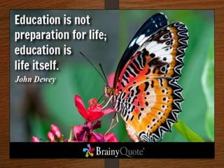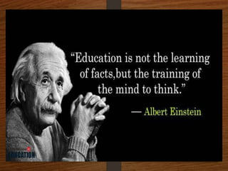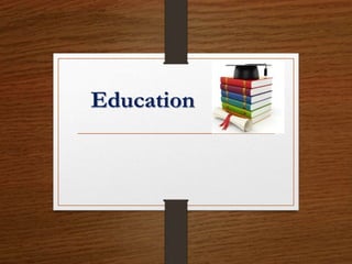 Education is defined as the process of imparting knowledge and skills through instruction and study. It involves bringing about desirable changes in behavior and is directed towards a socially acceptable end. The main types of education are formal, non-formal, and informal. Formal education takes place in institutional settings and leads to certificates and degrees. Informal education occurs through daily experiences and exposure to one's environment. Non-formal education is flexible and takes place outside formal systems, using participatory approaches. The real purpose of education is to help people become better individuals by developing enlightenment, knowledge, personality, and leadership qualities.
