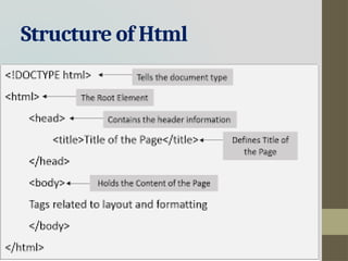 The document discusses the structure of HTML and various text formatting tags, including bold, italic, and font color. It provides examples of creating ordered and unordered lists in HTML, demonstrating the proper syntax. Additionally, it includes activities for creating and ordering lists using the appropriate HTML tags.