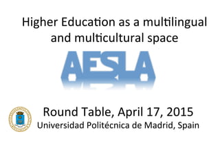 The document discusses a round table on higher education as a multilingual and multicultural space held at the Universidad Politécnica de Madrid in April 2015. It covers various contributions regarding the challenges of bilingual programs, the implementation of English-medium instruction (EMI), and the role of multilingual policies in internationalization within higher education. Key themes include the necessity of careful planning for multilingualism, the attitudes of different university bodies towards language education, and strategies for ensuring quality in plurilingual programs.