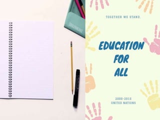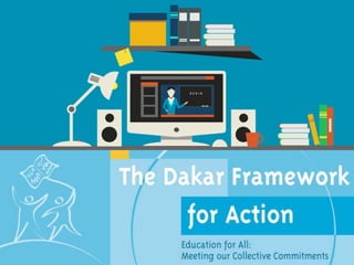The document outlines a comprehensive plan for achieving the 'Education for All' initiative, detailing specific goals and regional strategies to enhance educational access and quality. It highlights significant challenges and progress from 2000 to 2015, including enrollment rates and literacy achievements across various regions, particularly focusing on the Philippines. The need for continued investment and reform is emphasized to meet future educational targets by 2030.