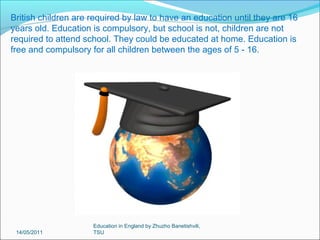 British children are required by law to receive an education until age 16, which can take place at school or through homeschooling. The school year runs from September to July and is divided into 3 main holiday periods: Christmas, Spring, and Summer. Children typically begin primary school at age 4-5 and move to secondary school at age 11, then are required to continue their education or training until age 16. The National Curriculum determines the core subjects taught in state schools, such as English, math, science, and history.