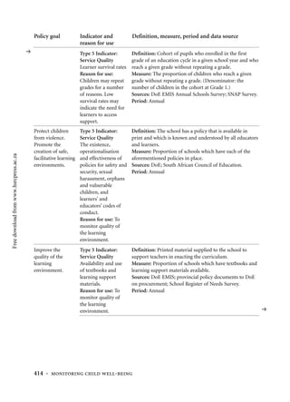The document outlines several core education indicators and their definitions that can be used to monitor progress towards policy goals in education. It provides indicators related to learner achievement, dropout rates, repetition rates, language of instruction, educator-learner ratios, educator qualifications, and the orphan school attendance ratio. The indicators are defined and include proposed measures, data sources, and collection periods.