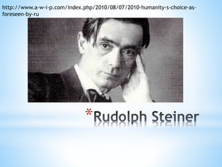 Waldorf schools originated in Germany in the early 1900s and were developed to provide education for factory workers. The schools used a curriculum developed by Rudolf Steiner based on the philosophy of anthroposophy, which viewed spiritual, physical and mental development as interconnected. Waldorf education has three stages - ages 0-7 focus on imagination, ages 7-14 on developing literacy while keeping students with the same teacher, and ages 14-21 on abstract thinking, ethics and career preparation. Some key principles include an emphasis on art, music, outdoor activities and storytelling, and keeping early education simple and experiential. Over time Waldorf schools spread internationally but faced challenges under Nazi rule in Germany.