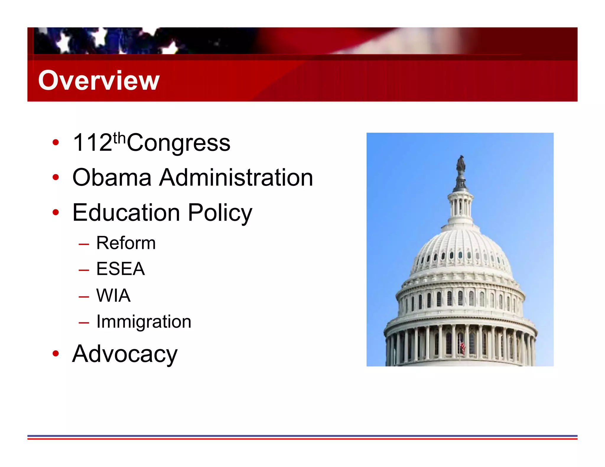This document provides an overview of education policy issues in the 112th United States Congress and Obama Administration. It summarizes the partisan makeup of Congress, key education committees and their chairs, the Department of Education leadership, and major education reform initiatives like Race to the Top, Common Core, and ESEA reauthorization efforts. It also outlines adult education legislation, immigration and integration policies, and advocacy resources on education issues.