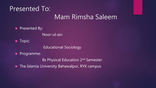 This presentation discusses educational sociology. It defines educational sociology as the study of how social relationships and public institutions influence education and its outcomes. The aims of educational sociology are to understand how social factors like family, class, culture, and school affect students. Its scope includes examining concepts like society, culture, socialization, and the relationship between social structures and school structure. The functions of educational sociology are the diffusion of knowledge, social control, cultural transmission, social progress, and facilitating social development and change.