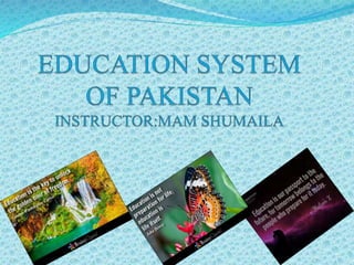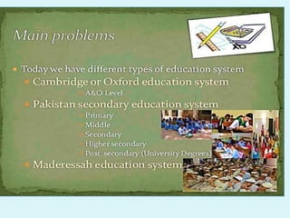 The document discusses education in Pakistan. It lists group members and provides information on the definition, purpose, importance and aims of education. It describes Pakistan's education system including levels, types of education, literacy rates between provinces and genders, and challenges facing the system. It compares rural and urban school systems and lists recommendations to address problems like untrained teachers and unequal standards.