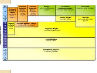 Lithuania's education system includes pre-school, primary and lower secondary school, upper secondary school, vocational education, and higher education. There are 22 universities and 28 colleges that provide higher education. Primary and lower secondary school is compulsory from ages 6-7 and lasts 10 years, followed by optional upper secondary school or vocational education. Vocational education includes 4 types of programs that can lead to certification or allow students to continue their education. Higher education is provided at universities and non-academic colleges, and typically involves 4 years of study to earn a Bachelor's degree.