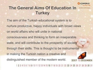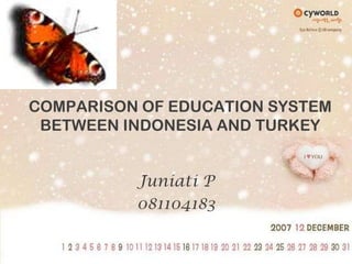 The education systems of Indonesia and Turkey share some similarities but also have some differences. Both systems have pre-primary education that is not compulsory, followed by compulsory primary education from ages 6-11 in Indonesia and 6-14 in Turkey. In secondary education, Indonesia has junior high from ages 13-15 and senior high/vocational schools from 16-18, while Turkey offers secondary education from ages 14-17. For higher education, both countries have public and private universities and institute that offer degrees up to the doctorate level. Turkey also has a non-formal education system that provides additional training outside the formal system.