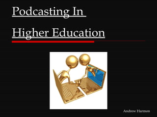 The document discusses the use of podcasting in higher education based on three articles. Podcasting can increase flexibility by allowing students to access course material anywhere and anytime. It also enhances learning when used interactively, such as by having students create their own podcasts. Several universities discussed are using podcasting in creative ways, such as for language learning, distributing campus information, and facilitating online course discussions. Overall, podcasting works best not just as a replacement for lectures but when utilized interactively.
