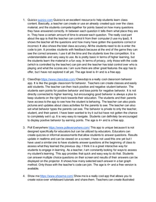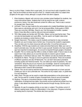 The document lists various educational apps primarily in the English subject area, detailing their features, potential uses in classrooms, and accessibility. Each app emphasizes different aspects of learning, including quizzes, presentation creation, reading encouragement, and online organizational tools. Many apps are user-friendly, support offline access, and have been reported to positively influence student engagement and performance.