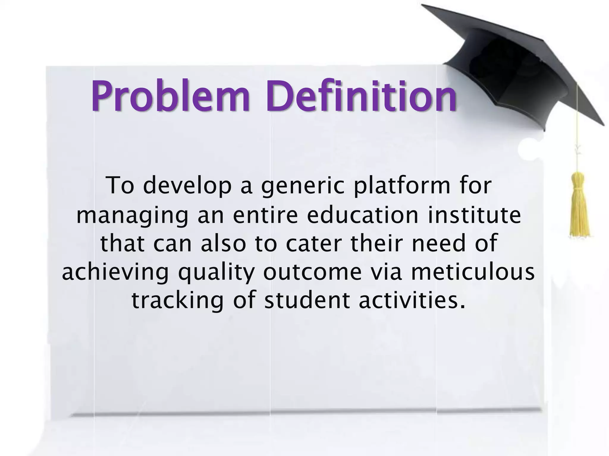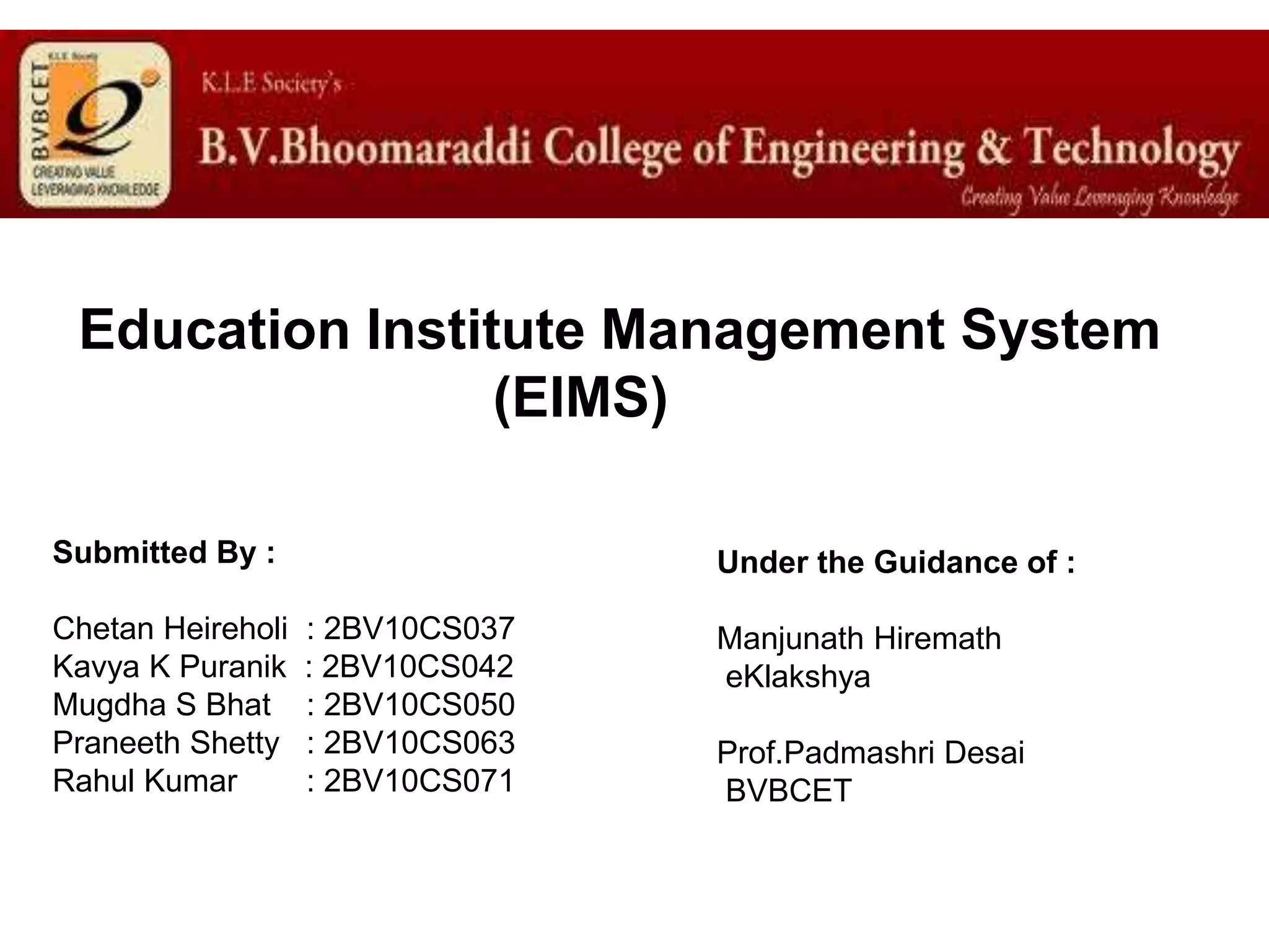 The document outlines the development of an Education Institute Management System (EIMS) that aims to manage various educational tasks including program, course, student, faculty, and assessment management. It highlights the platform's features such as online quizzes, report generation, and robust security, while emphasizing its flexibility for different types of educational institutions. Future enhancements could involve integration with attendance management systems and mobile applications.