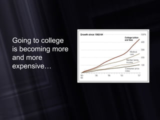 The document discusses the increasing financial burden of college education and emphasizes the importance of measuring educational outcomes. It raises questions about the value of different degrees and schools, suggesting a need for schools to track and demonstrate alumni success, salary, and satisfaction. The authors propose building a comprehensive database to analyze job outcomes and career relevance, highlighting the importance of understanding alumni trajectories to improve educational quality and competitiveness.