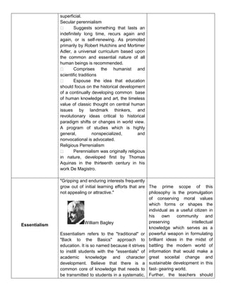 This document discusses five major educational philosophies: perennialism, essentialism, progressivism, existentialism, and pragmatism. Perennialism focuses on teaching reasoning and wisdom through subjects and doctrine with a highly disciplined approach. Essentialism emphasizes teaching intellectual and moral standards through a core curriculum of essential knowledge and skills. Progressivism believes education should focus on the whole child through active learning rooted in the learner's experiences. Existentialism rejects set truths and focuses on helping students understand themselves and accept responsibility for their own development. Pragmatism sees education as a means to solve problems and believes learning happens through active experimentation.
