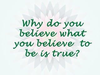 The document discusses different philosophical beliefs regarding the origins and nature of knowledge. It describes empiricism as the view that all knowledge is derived from sensory experience and the senses. More radical forms of empiricism hold that only claims that can be empirically tested and verified have meaning. Moderate empiricism allows some exceptions. Idealism believes objective knowledge is subjective and ideas are most important. Positivism is the view that assertions must be scientifically verified or logically/mathematically proven to be considered knowledge, rejecting metaphysics and theism. Auguste Comte argued knowledge develops through theological, metaphysical and positive stages focused on science.