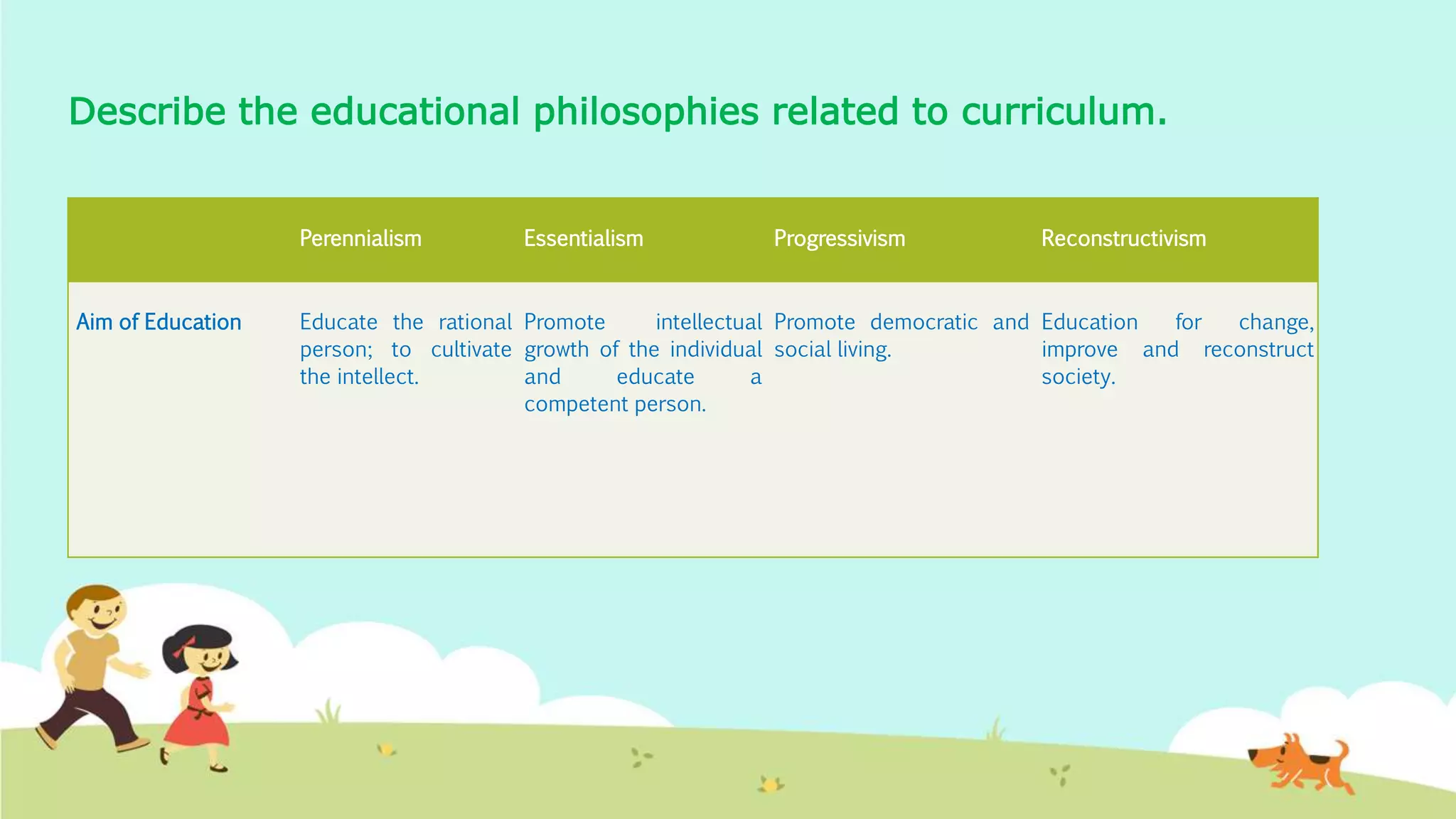 This document summarizes four educational philosophies - perennialism, essentialism, progressivism, and reconstructivism - and how they influence curriculum development. It describes the key aspects of each philosophy, including their aims of education, the role of teachers, curriculum focus, and trends. Additionally, it discusses how theories from philosophers like Piaget, Vygotsky, and influences from Reggio Emilia shape the curriculum at a child development center to be developmentally appropriate, child-centered, and focused on active learning through exploration and social interaction. Philosophy guides the overall goals and approaches to education, while curriculum implements these philosophically-driven ideas into specific learning experiences.