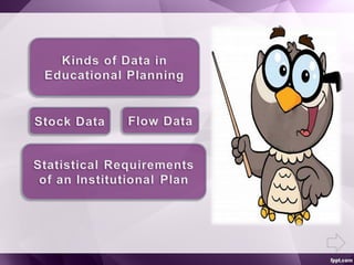 Stock data describe the current state of the educational system by providing total numbers of schools, teachers, and students by education type and level. Flow data describe the internal dynamics of the system through metrics like promotion rates, repetition rates, and dropout rates. Effective educational planning requires statistical data on school facilities and personnel, student populations, education costs and finances, and projects by education type and level.