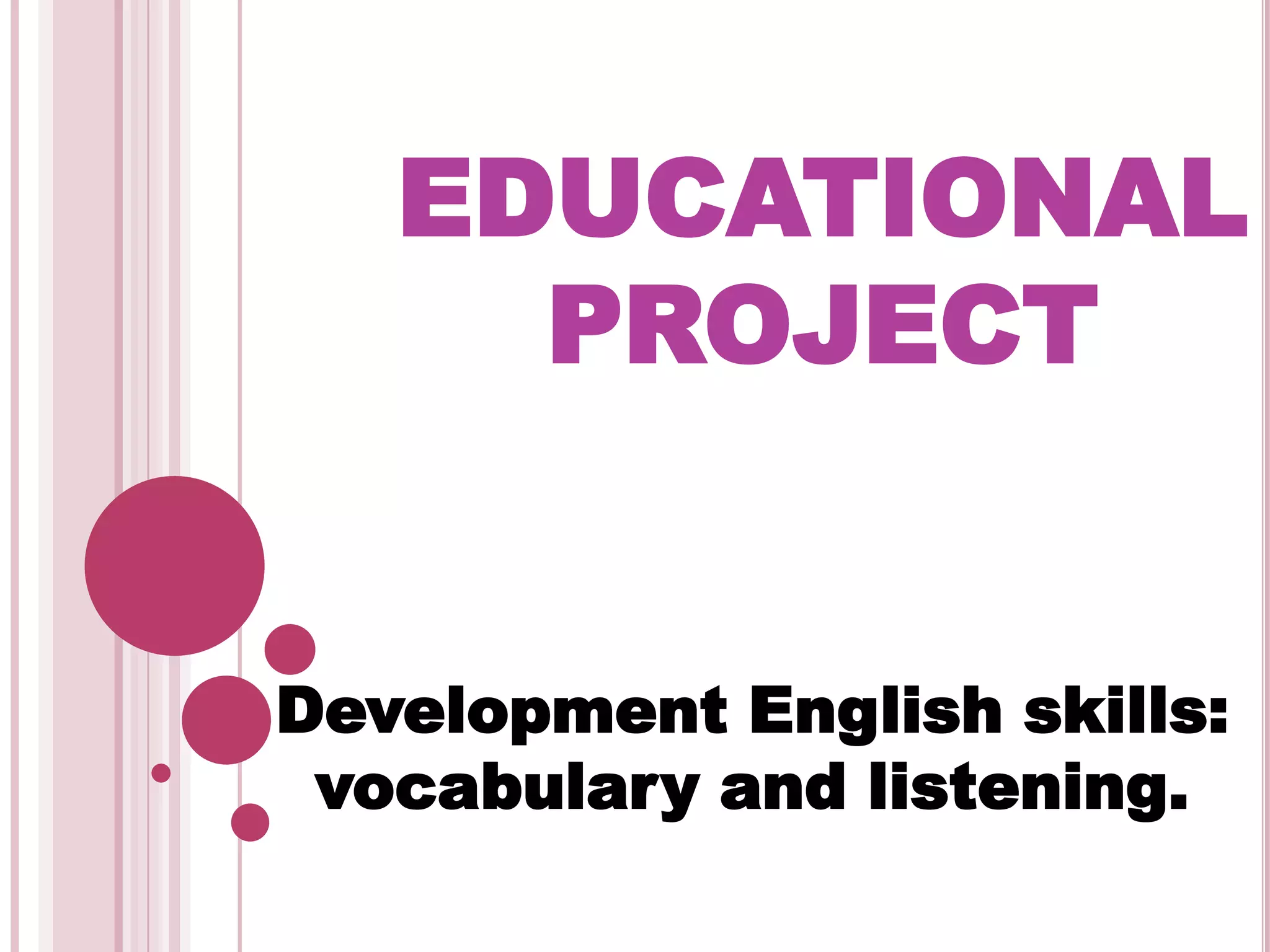 This educational project is designed to help 6th grade primary school students improve their English vocabulary and listening skills through interactive activities and materials. The project focuses on building vocabulary through creative memorization techniques and spending time learning words every day. It also aims to enhance listening skills, which research shows takes up 45% of human communication time, by providing resources to practice listening attentively in a comfortable way.