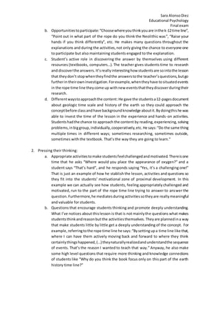 The document discusses an educational video featuring a teacher who emphasizes deep learning through mathematical concepts and critical thinking rather than rote memorization. The teacher fosters a collaborative learning environment where students engage with each other to enhance understanding, explore concepts through various activities, and actively participate in their own learning process. By integrating challenging questions and hands-on experiences, the teacher aims to maintain student motivation and interest in the subject matter.