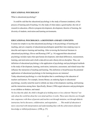 3. Educational psychology helps teachers understand individual learner differences, create positive learning environments, select appropriate teaching strategies, provide student guidance, and evaluate learning outcomes. It also assists with establishing learning objectives, using educational tools, and lesson planning.