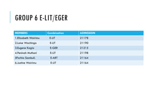 The document outlines a research conducted by a group on the educational resources available at Kagumo Teachers Training College's library. It identifies various types of resources, including print media, audio-visual/digital resources, and internet connectivity, while also highlighting professional development roles of teachers and librarians. Additionally, it addresses challenges in accessing indigenous language materials and recommends field trips to enhance understanding of cultural contexts.