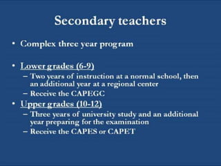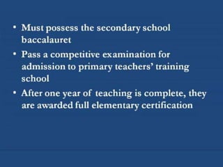 The French education system is centralized and governed by the Ministry of National Education, which employs teachers at primary and secondary levels, as well as university professors and researchers. It consists of three stages: primary education, secondary education, and higher education, and operates under a secular policy developed after the Jules Ferry laws, which separates state-funded schools from religious organizations. Recent legislative measures, such as law 2004-228, banned conspicuous religious symbols in public schools, resulting in increased establishment of Islamic secondary schools and legal challenges surrounding the law's implementation.