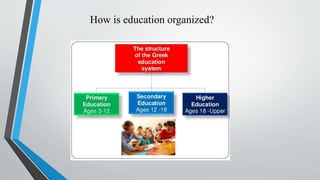 The Greek educational system is centralized and overseen by the Ministry of Education. It consists of pre-primary, primary, secondary, and higher education levels. Pre-primary is for ages 5-6 and primary is compulsory for ages 6-12, consisting of 6 years of elementary school. Secondary education is divided into junior high from ages 12-15 and higher secondary from ages 15-18, where students specialize in areas like sciences or arts. Higher education consists of universities, polytechnics, and other specialized institutions where courses typically last 4 years. The educational system aims to provide free public education for all students and a solid foundation in core subjects like Greek, math, and English.