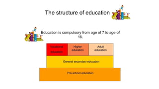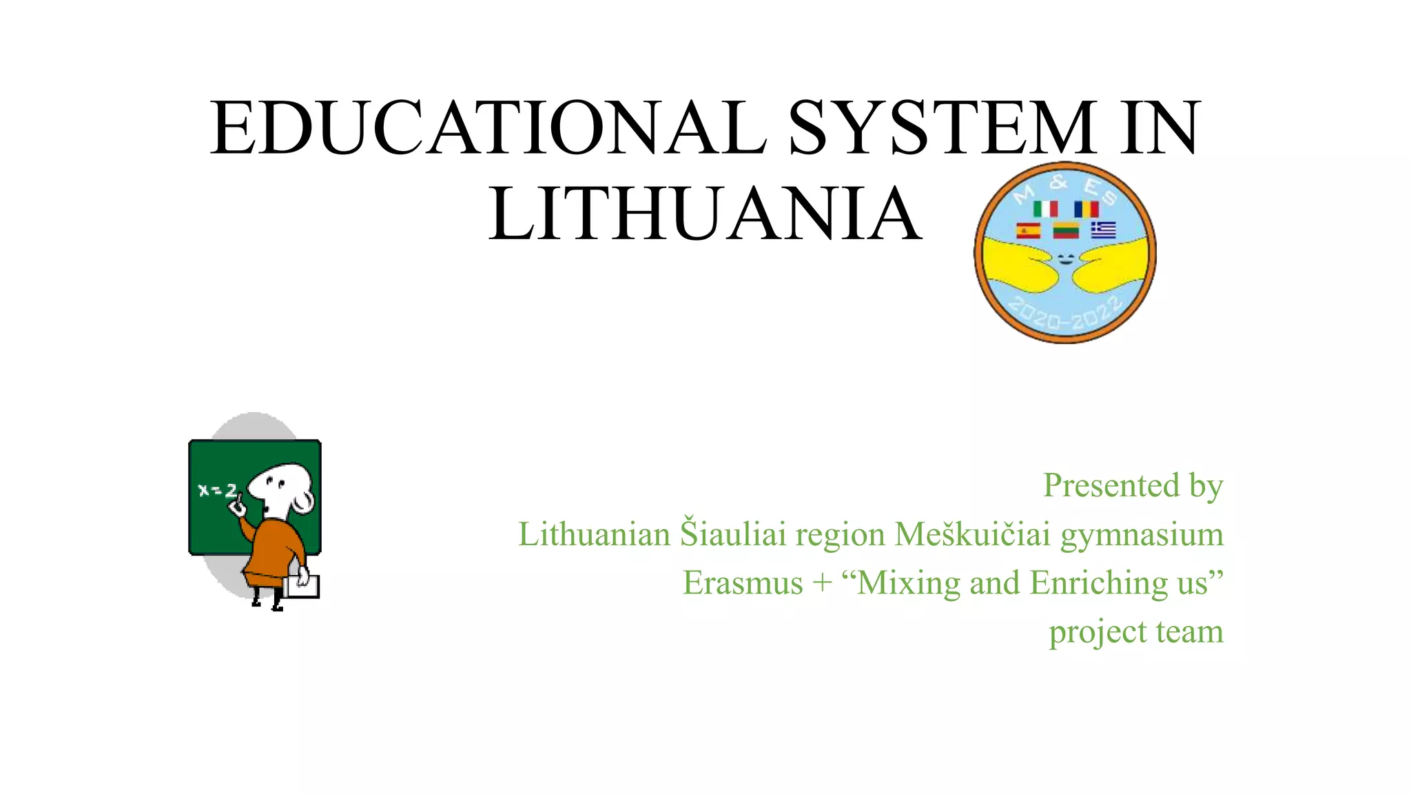 The educational system in Lithuania has several stages. Pre-school education is mandatory for children aged 6 and younger and focuses on social and cognitive development. Primary education lasts 4 years and emphasizes literacy, social, and cognitive skills. Basic education then lasts 6 years and provides general knowledge and skills. At upper secondary level, students can choose a gymnasium or vocational program. Vocational training results in a diploma upon completion of studies and exams. The educational system aims to develop students and prepare them for further education or work.